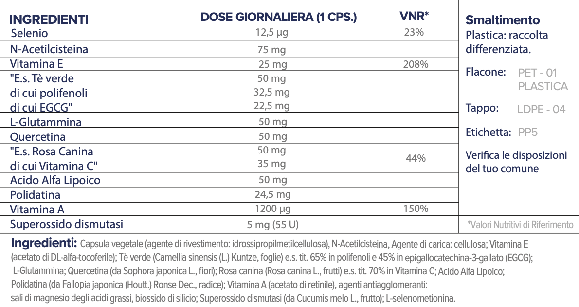 Integratore alimentare con N-Acetilcisteina, Vitamine A-C-E, Tè verde titolato in polifenoli/EGCG, Quercetina, Acido Alfa Lipoico, Polidatina, Selenio metionina e Superossido dismutasi (SOD). Protegge dallo stress ossidativo e sostiene il sistema immunitario, l’energia e la qualità della pelle.